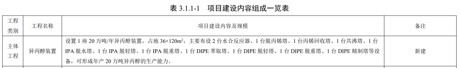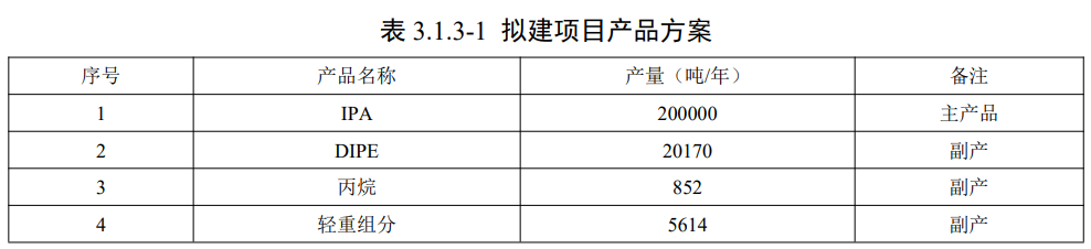 产品方案 年产20万吨异丙醇(简称IPA),副产约20170吨/年异丙醚(简称 DIPE)、852 吨/年丙烷、5614吨/年轻重组分。